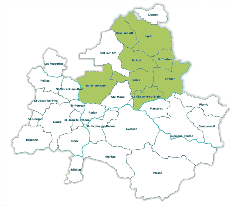 Les communes impliquées sont : Pipriac, Bains-sur-Oust, Saint-Just, Renac, Saint-Ganton, La Chapelle-de-Brain, Bruc-sur-Aff, Langon.