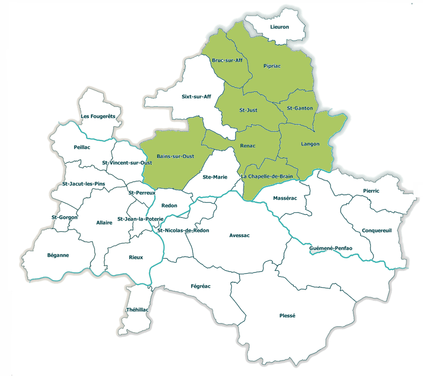 Les communes impliquées sont : Pipriac, Bains-sur-Oust, Saint-Just, Renac, Saint-Ganton, La Chapelle-de-Brain, Bruc-sur-Aff, Langon.