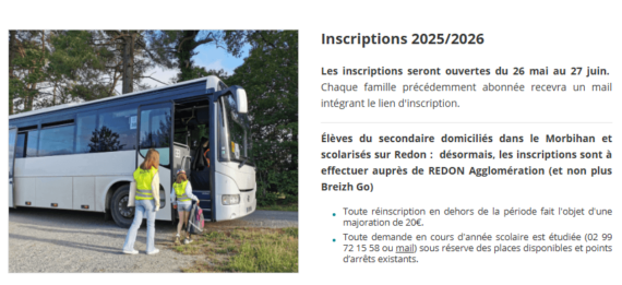 Les inscriptions en ligne pour le transport scolaire 2025/2026, pour toutes les communes du territoire de Redon Agglomération, ouvriront du lundi 26 Mai au vendredi 27 Juin 2025 sur le site de Redon Agglomération.