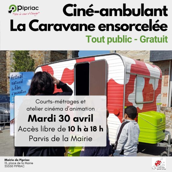 Toute la journée du mardi 30 avril, de 10 h à 18 h, de nombreux courts-métrages seront diffusés par La Caravane ensorcelée, stationnée Place de la Libération à Pipriac. Seul, en famille ou entre amis, venez vous détendre lors de cette animation culturelle ouverte à tous. C’est gratuit !