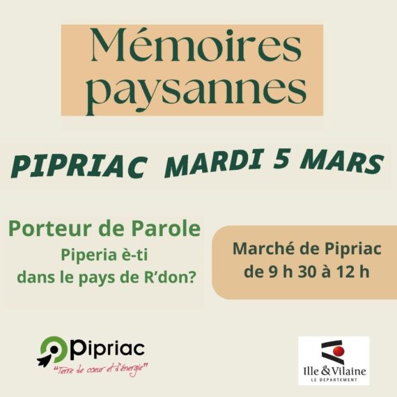 Le dispositif « Porteur de paroles » mis en place le mardi 5 mars 2024 à Pipriac vise à recueillir la parole des habitant, qui seront notamment à évoquer le sujet de la mémoire paysanne à Pipriac et invités à répondre à la question “Est-ce que Pipriac est dans le Pays de Redon”.