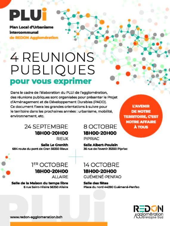 Dans le cadre de l’élaboration du Plan Local d’Urbanisme intercommunal (PLUi) de Redon Agglomération, une réunion publique est organisée pour présenter le Projet d’Aménagement et de Développement Durables (PADD).