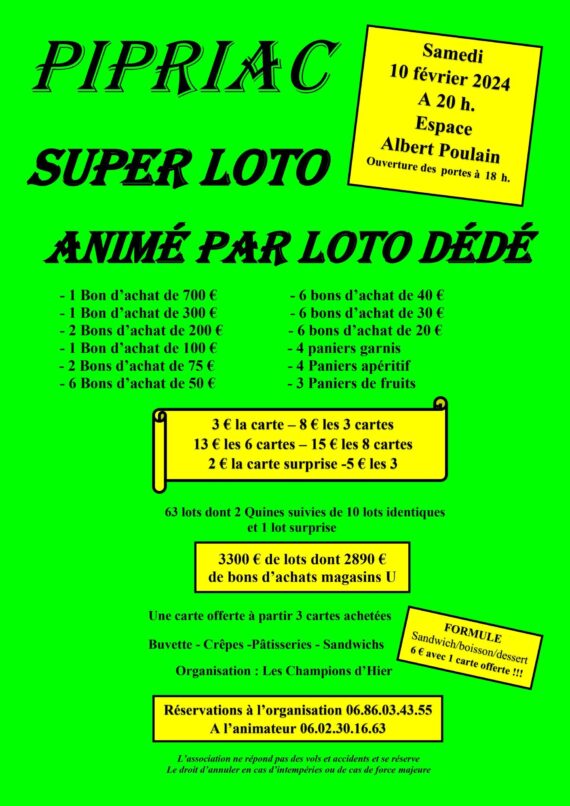 2 quines suivies de 10 lots identiques et un lot surprise. Bons d’achat en magasin U.