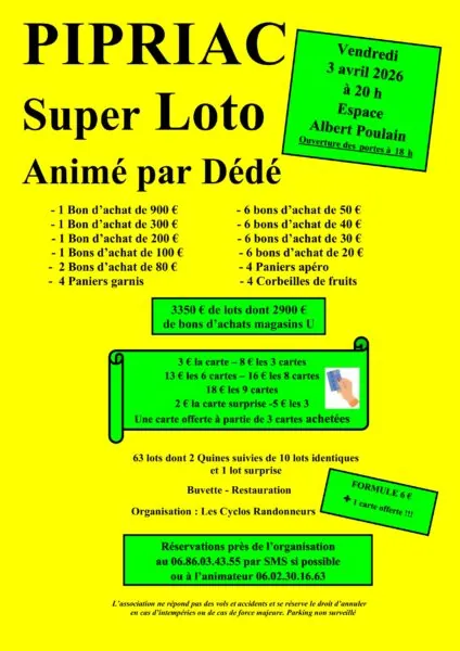 Pipriac, vendredi 3 avril Espace Albert Poulain, super loto des Cyclos Randonneurs.