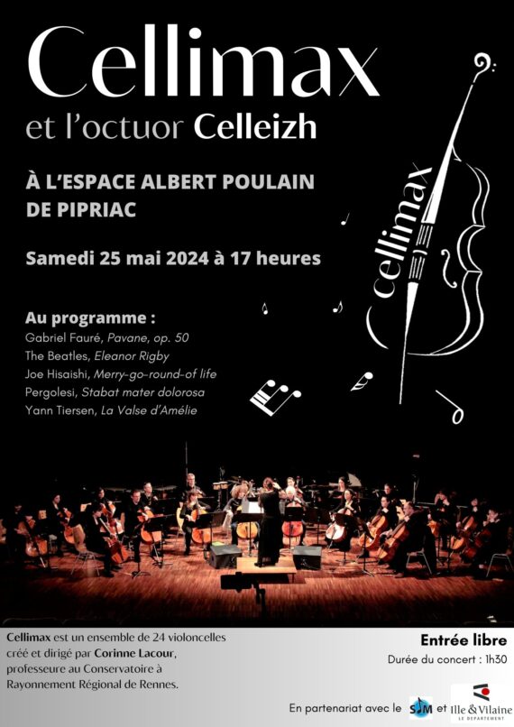 Cellimax et l'octuor Celleizh : concert d’un ensemble de 24 violoncelles créé et dirigé par Corinne Lacour, professeure au Conservatoire à Rayonnement Régional de Rennes.